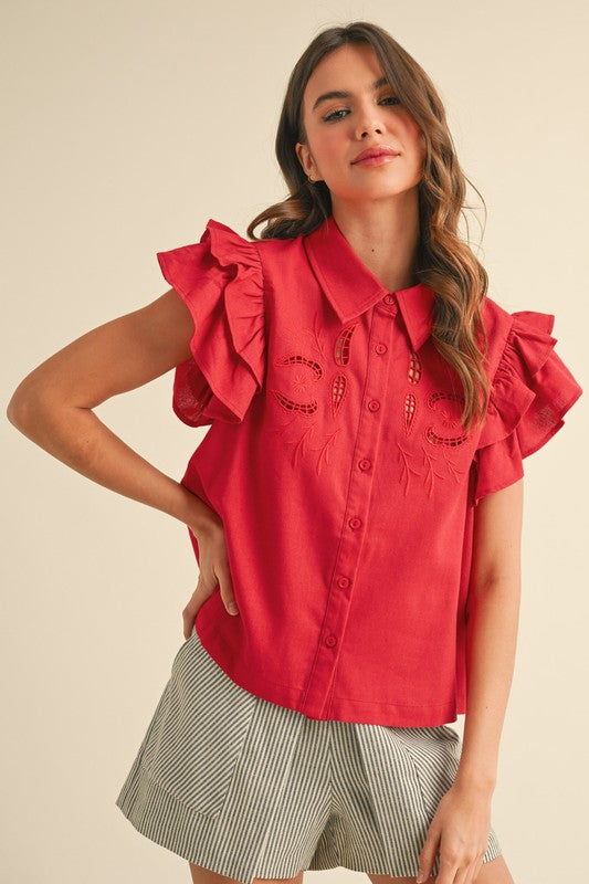 Blusa de lino con detalle de perforación y bordado. Cuello tipo americano. Mangas voladas.