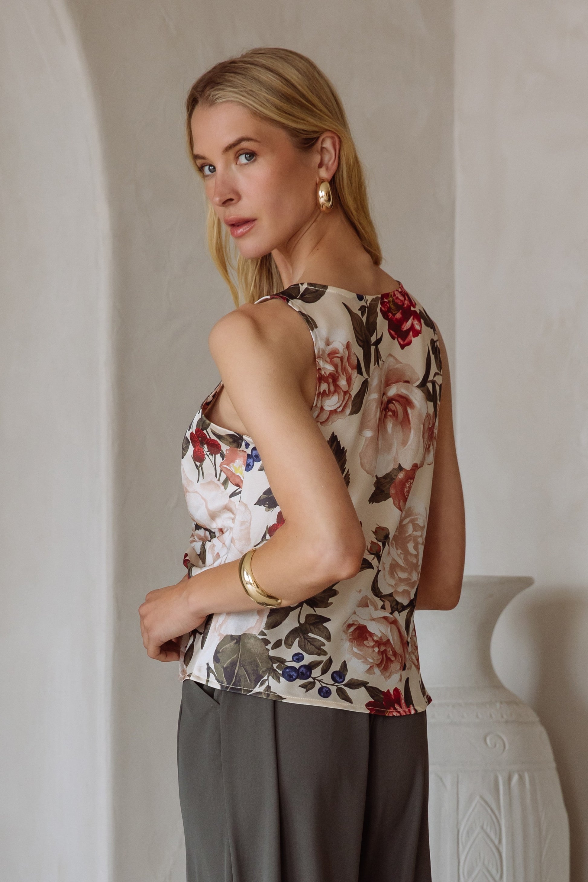 Blusa de tela satinada con estampado floral. detalle de lazo al frente. Escote en V.