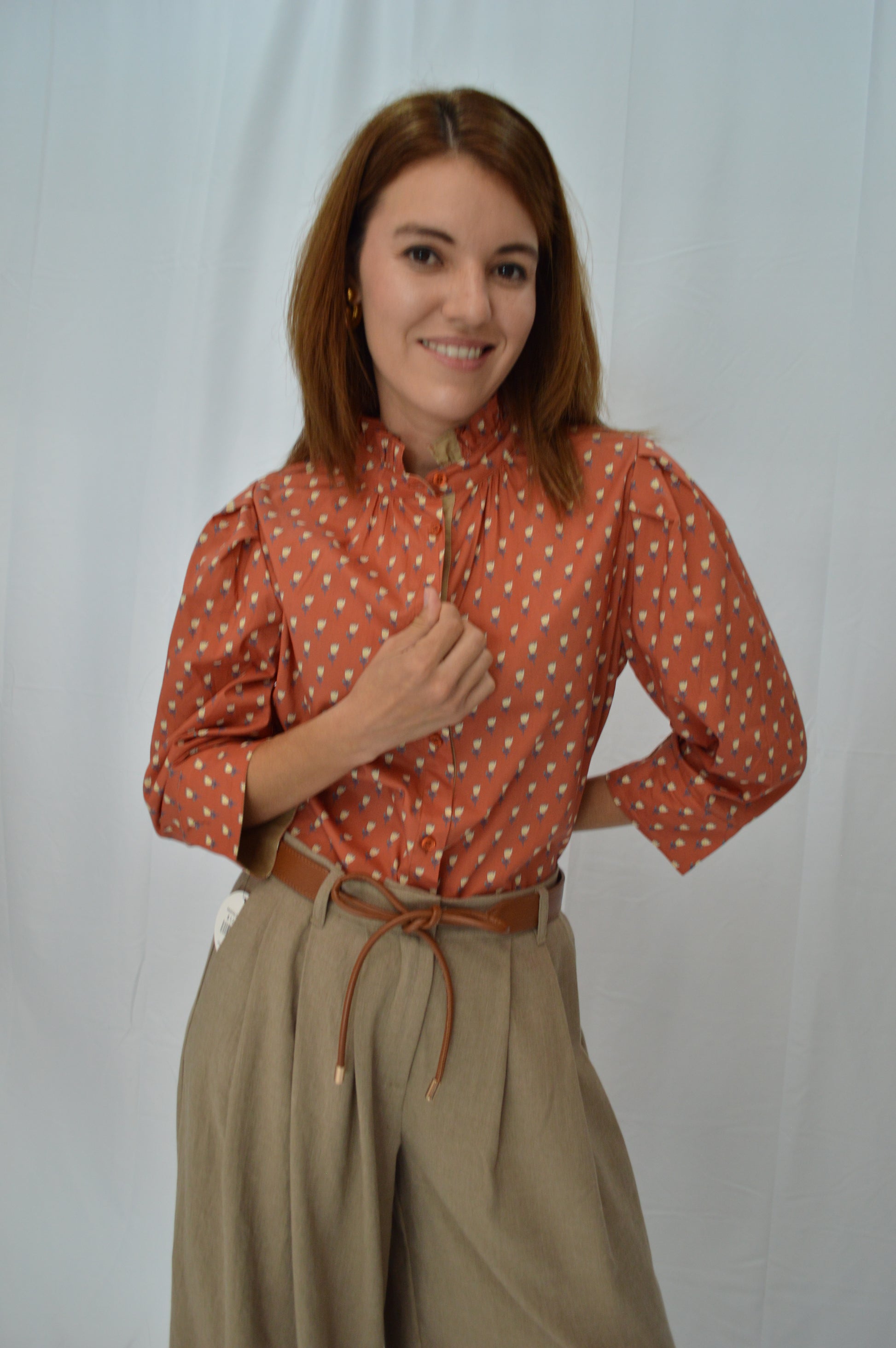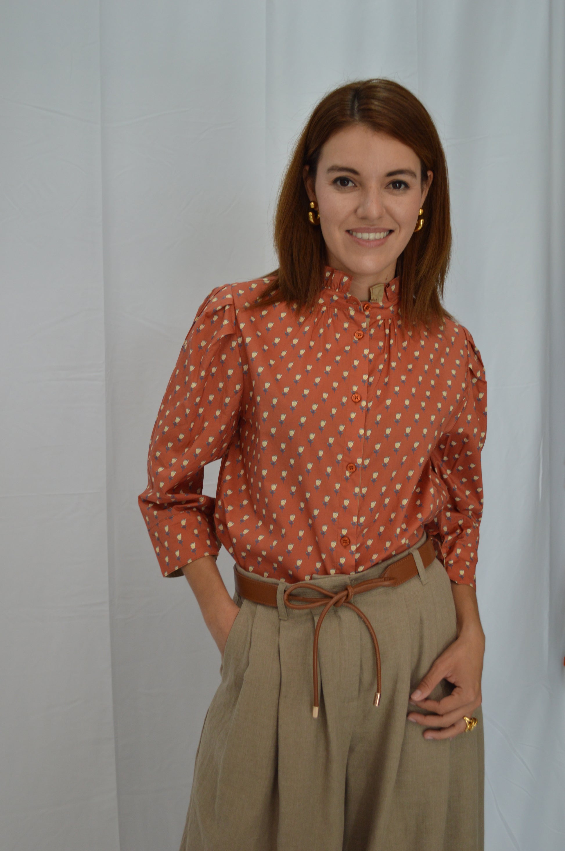 Blusa tipo camisero con estampado de tulipanes. Manga 3/4. Cuello en ruffle.