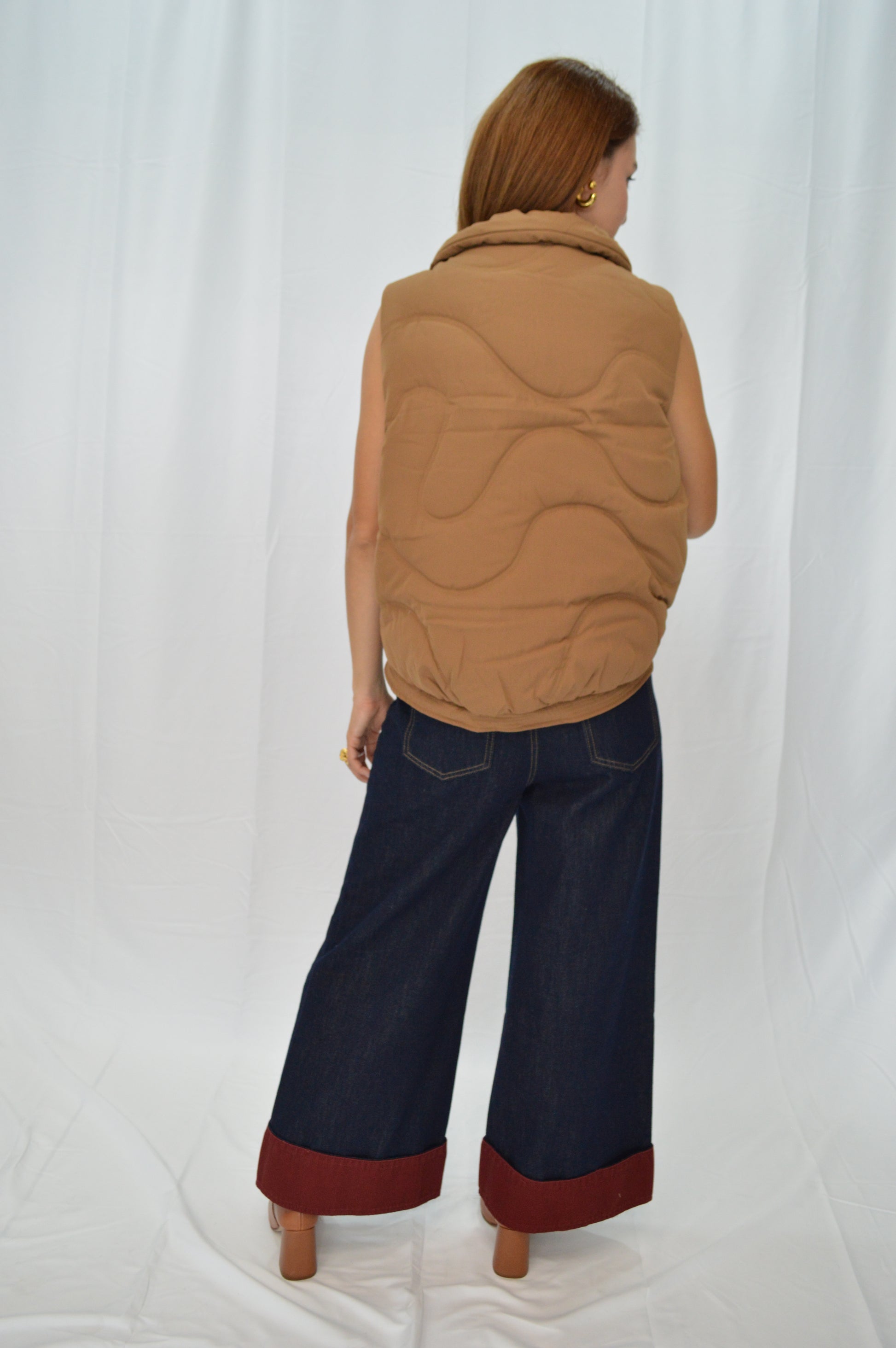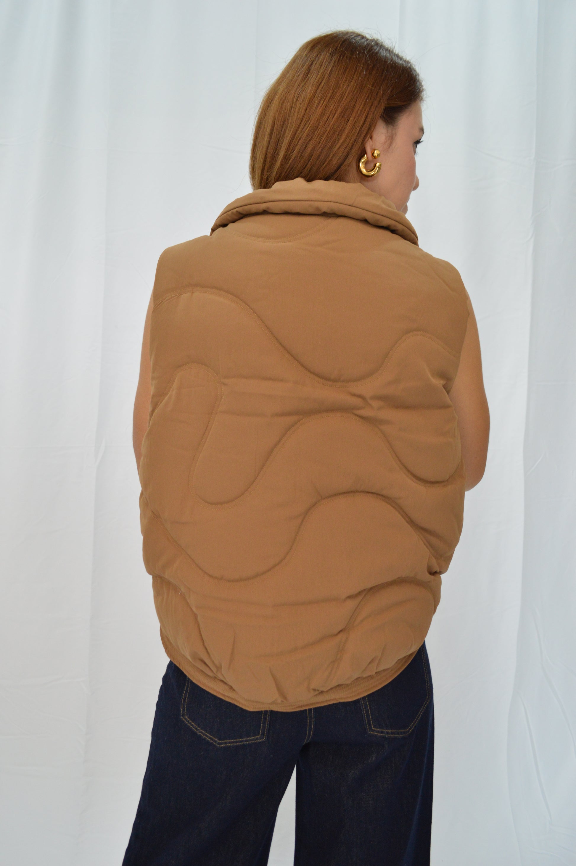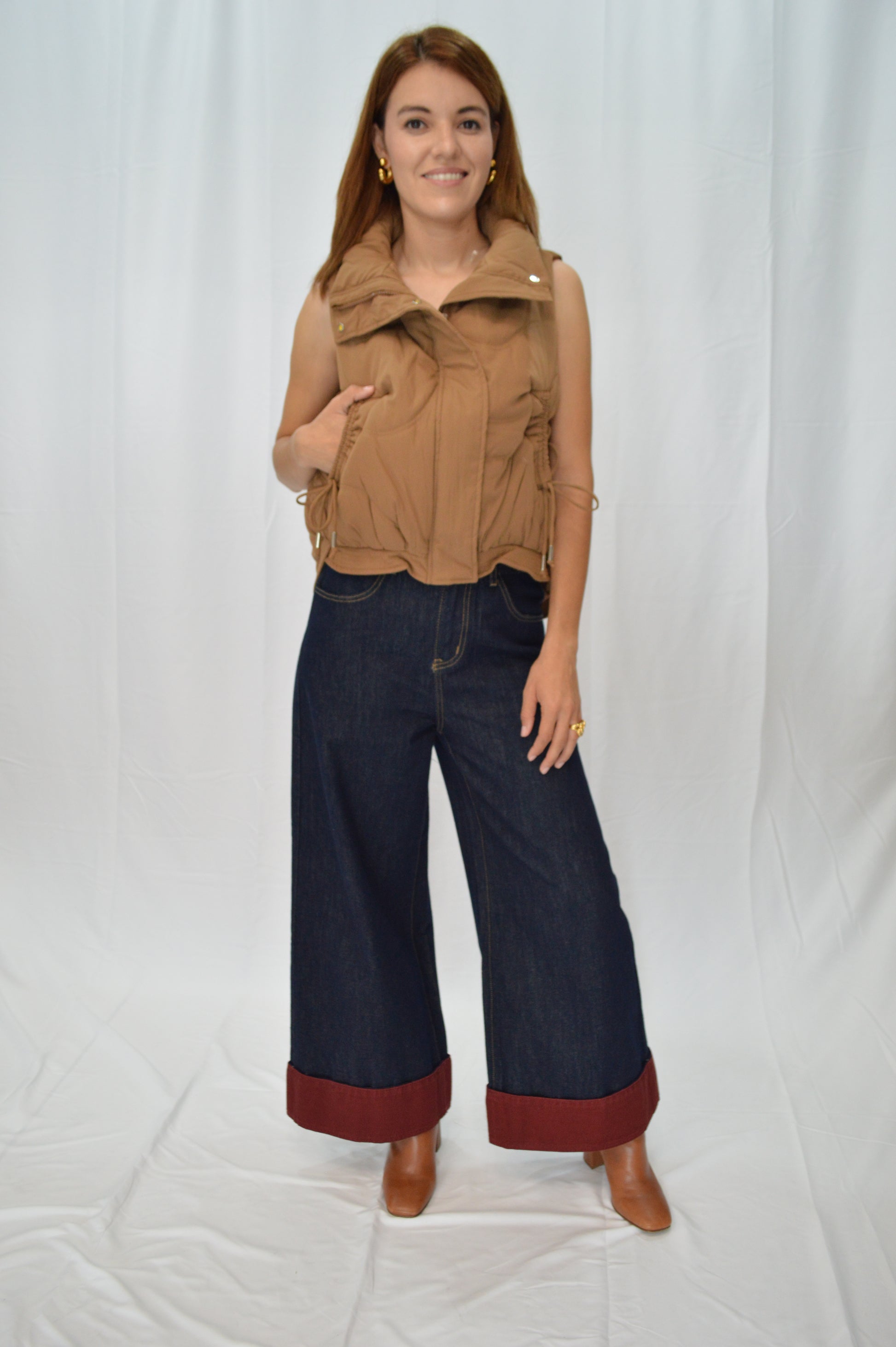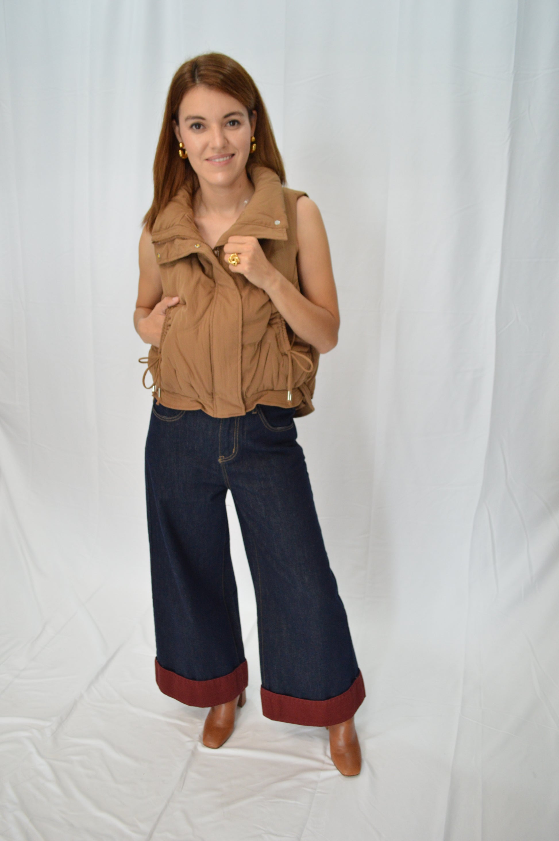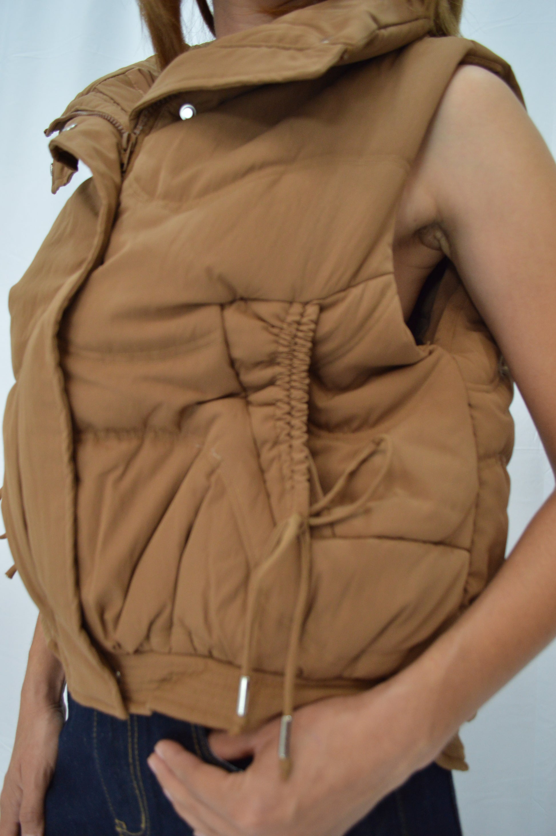 Chaleco asimétrico con detalle fruncido en bolsos laterales. Zipper y botones de presión.