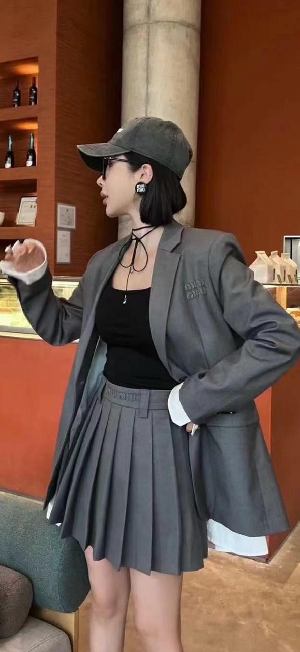 Conjunto de falda de tablones y blazer con simulacion de camisa (puños removibles) bordado miumiu
