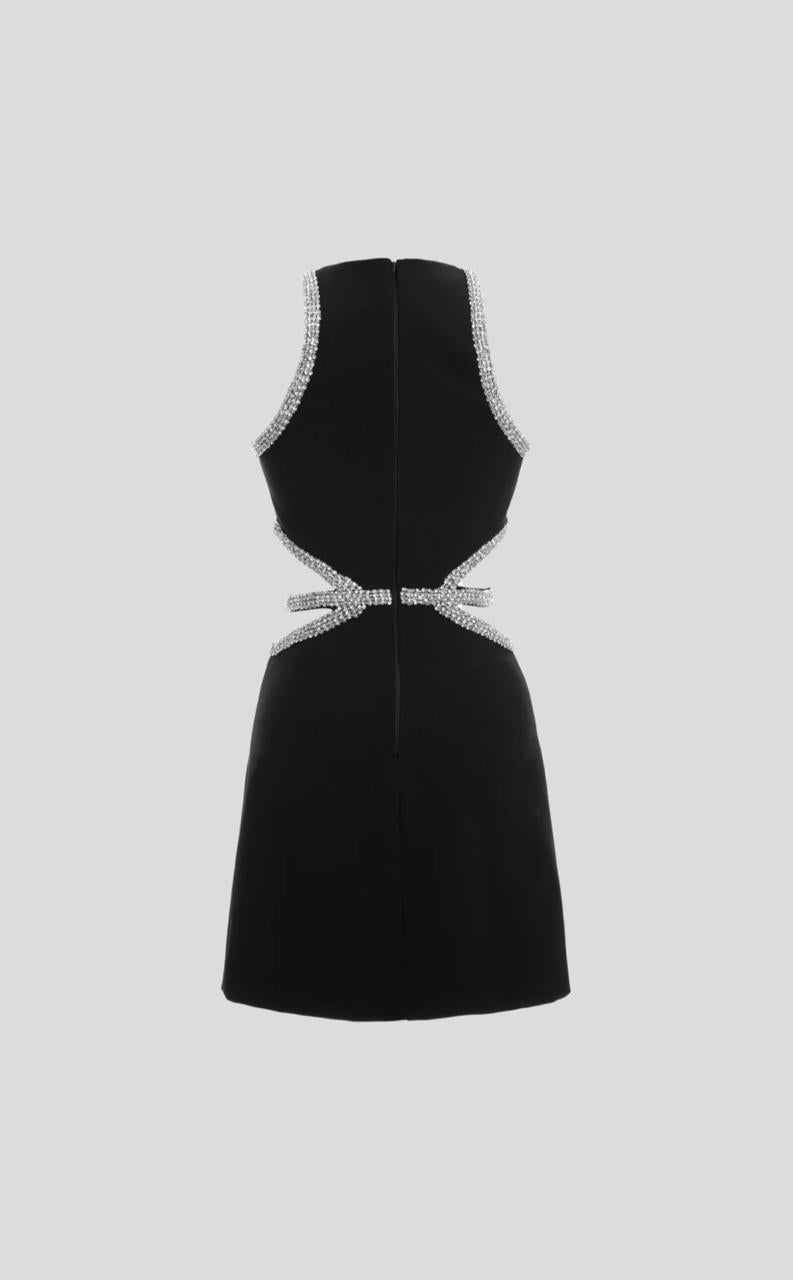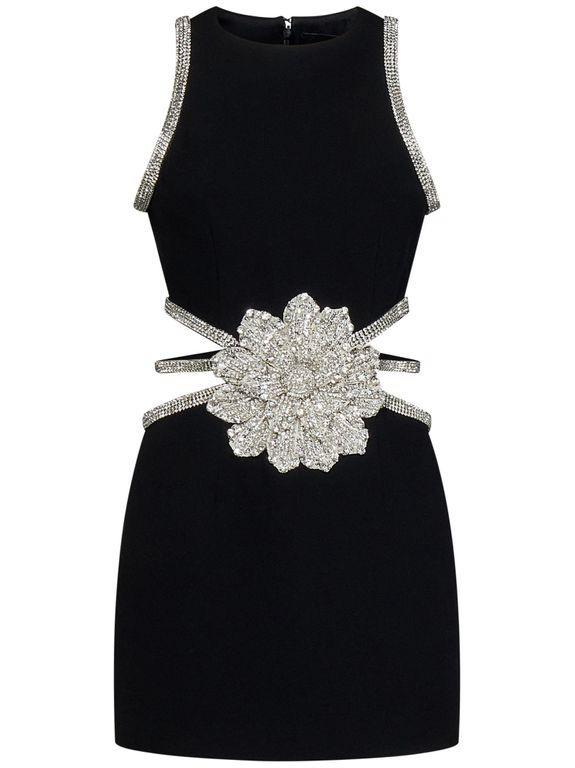 Vestido con abertura en los costados y aplicaciones de cristales y flor al frente